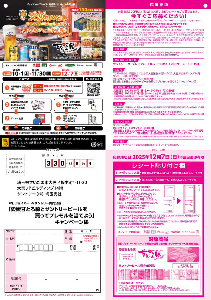 対象商品は、ノンアルコールビールテイスト飲料を含むサントリービール類の全缶商品と、「ジョイマート」傘下のスーパーマーケット各店舗で販売している「愛媛甘とろ豚」です。